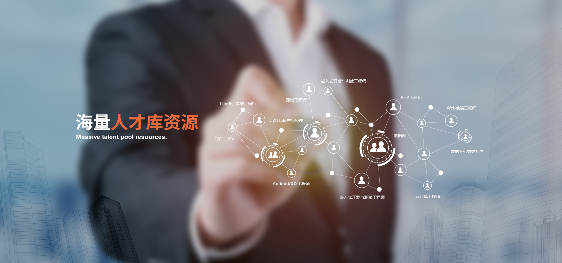 擁有超10萬以上的人才儲備;包括專家級、、資深級、高級、中級等各技術(shù)崗位,能滿足客戶快速用人的需求